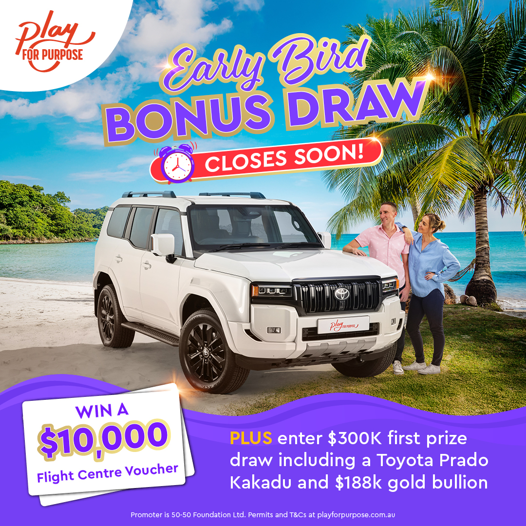 Buy your raffle ticket by 8 October 2025 and you’ll go into the Early Bird Bonus Draw to win a $10,000 Flight Centre Voucher.